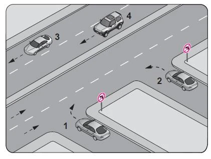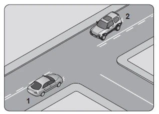 Şekildeki kavşakta 1 numaralı araç sağa, 2 numaralı araç ise sola dönüş yapmak istemektedir.