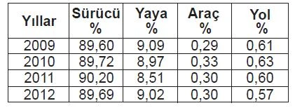 Ülkemizde, trafik kazalarındaki kusur oranlarının (%) yıllara göre dağılımı tablodaki gibidir?