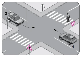 Şekildeki gibi sola dönüş yapacak olan 2 numaralı araç sürücüsü aşağıdakilerden hangilerini yapmalıdır?